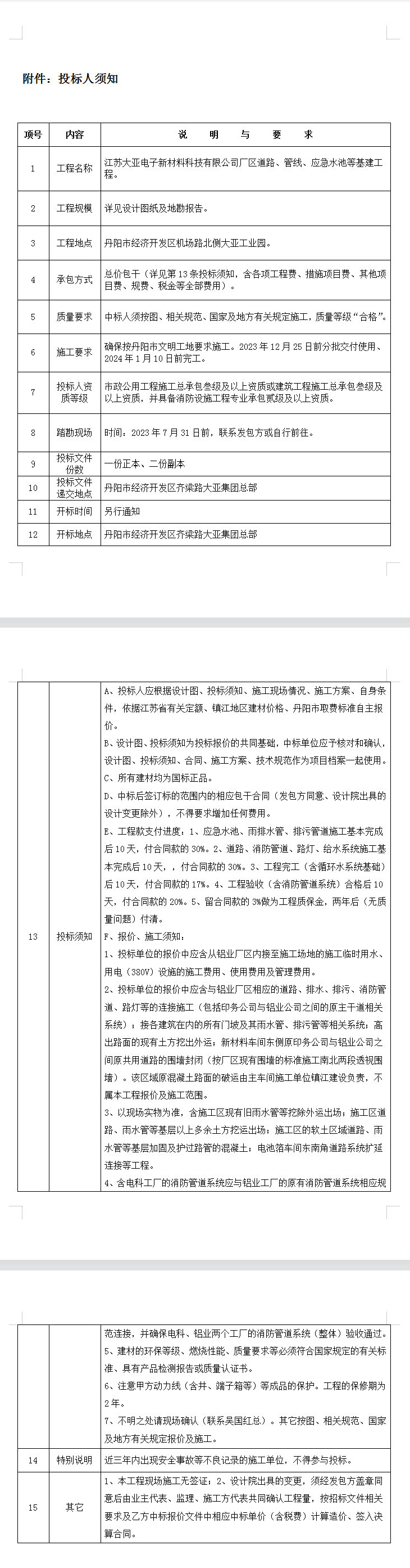 本招標項目 廠區(qū)道路、管線、應急水池等基建工程 已批準建設,招標人為 江蘇大亞電子新材料科技有限公司 ,建設資金來自 自籌 。項目已具備招標條件,現進行公開招標,特邀請有興趣的潛在投標人(以下簡稱申請人)提出資格預審申請。