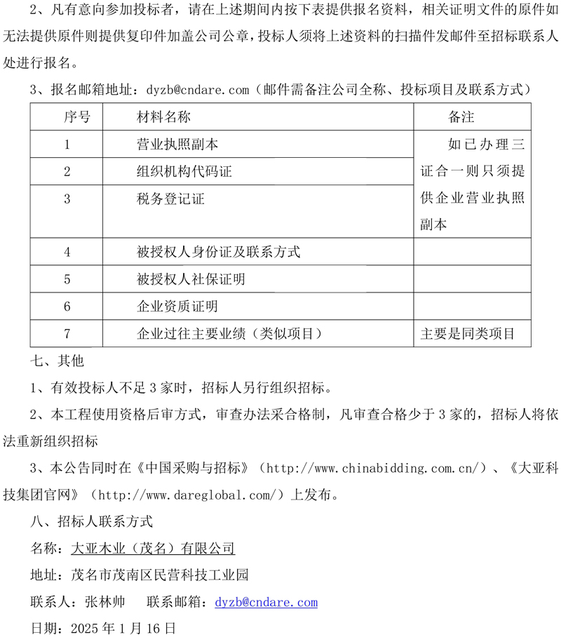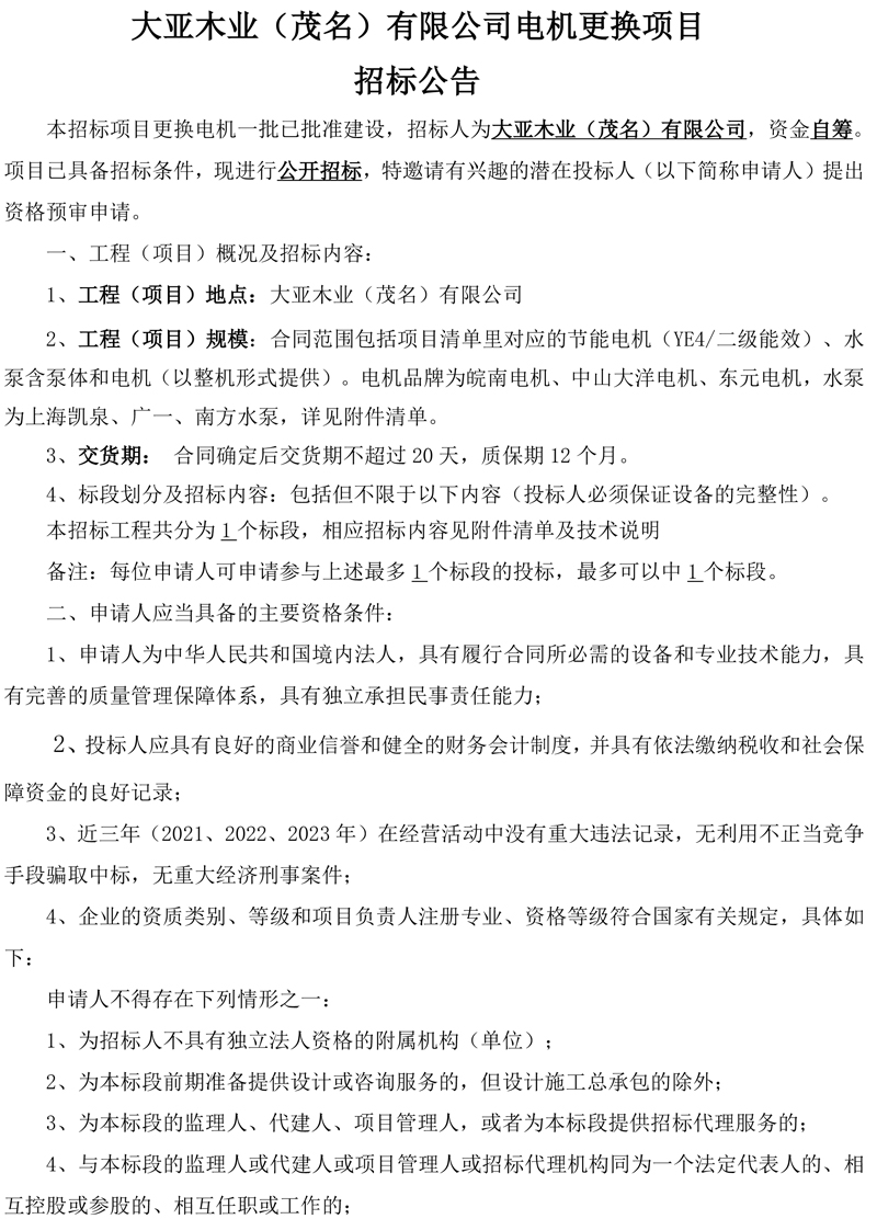 大亞木業(yè)(茂名)有限公司電機(jī)更換項(xiàng)目二次公告