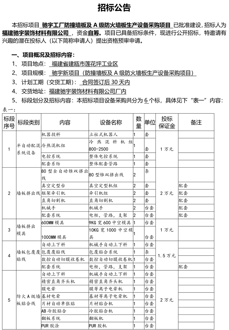 馳宇工廠防撞墻板及A級防火墻板生產(chǎn)設(shè)備采購項目招標(biāo)公告
