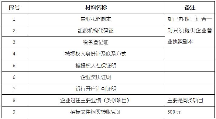2、 凡有意向參加投標者,請在上述期間內(nèi)按下表提供報名資料,相關(guān)證明文件的原件如無法提供原件則提供復印件加蓋公司公章,投標人須將上述資料的掃描件發(fā)郵件至招標聯(lián)系人處進行報名。
