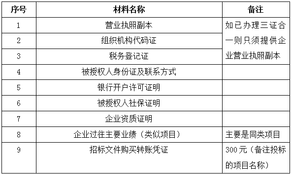2、 凡有意向參加投標者,請在上述期間內按下表提供報名資料,相關證明文件的原件如無法提供原件則提供復印件加蓋公司公章,投標人須將上述資料的掃描件發郵件至招標聯系人處進行報名。