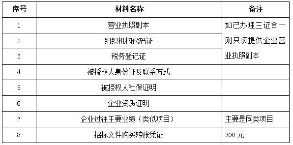 2、 凡有意向參加投標者,請在上述期間內(nèi)按下表提供報名資料,相關(guān)證明文件的原件如無法提供原件則提供復(fù)印件加蓋公司公章,投標人須將上述資料的掃描件發(fā)郵件至招標聯(lián)系人處進行報名。