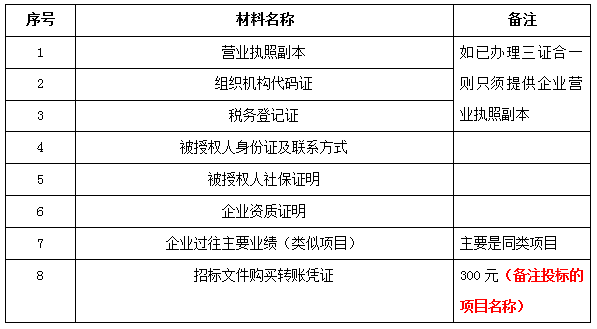 2、 凡有意向參加投標者,請在上述期間內按下表提供報名資料,相關證明文件的原件如無法提供原件則提供復印件加蓋公司公章,投標人須將上述資料的掃描件發郵件至招標聯系人處進行報名。