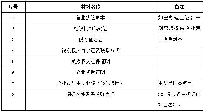 2、 凡有意向參加投標者,請在上述期間內按下表提供報名資料,相關證明文件的原件如無法提供原件則提供復印件加蓋公司公章,投標人須將上述資料的掃描件發郵件至招標聯系人處進行報名。