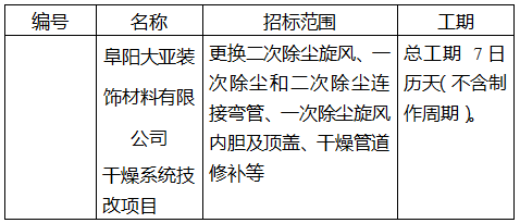 阜陽(yáng)大亞裝飾材料有限公司干燥系統(tǒng)技改項(xiàng)目招標(biāo)公告