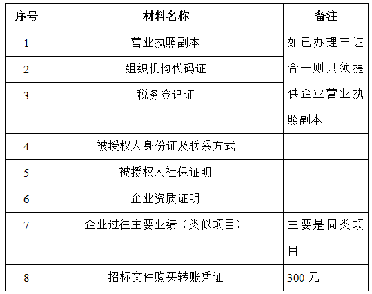 2、 凡有意向參加投標(biāo)者,請(qǐng)?jiān)谏鲜銎陂g內(nèi)按下表提供報(bào)名資料,相關(guān)證明文件的原件如無(wú)法提供原件則提供復(fù)印件加蓋公司公章,投標(biāo)人須將上述資料的掃描件發(fā)郵件至招標(biāo)聯(lián)系人處進(jìn)行報(bào)名。