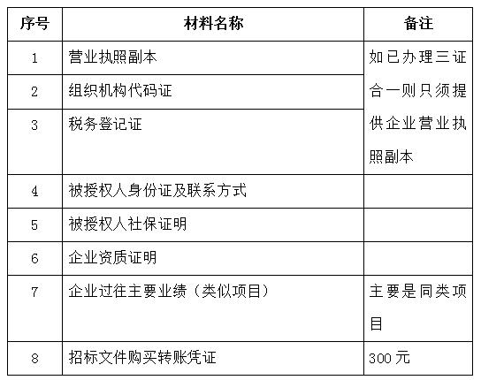 2、 凡有意向參加投標(biāo)者,請?jiān)谏鲜銎陂g內(nèi)按下表提供報(bào)名資料,相關(guān)證明文件的原件如無法提供原件則提供復(fù)印件加蓋公司公章,投標(biāo)人須將上述資料的掃描件發(fā)郵件至招標(biāo)聯(lián)系人處進(jìn)行報(bào)名。報(bào)名電子郵件: