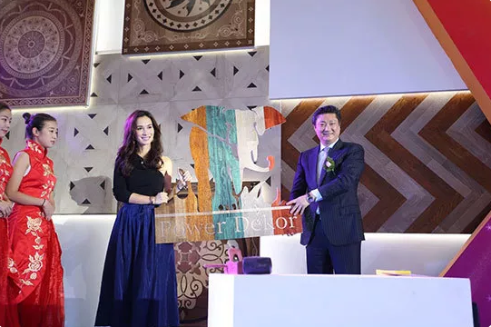 圣象集團總裁陳建軍和盧靖姍用釘地板的形式拼出了圣象的嶄新七彩象標。陳建軍總裁在現場互動時表示,未來消費者需求是多樣化的,我們的初心是從消費者出發,我們在新時代下的歷史任務就是從客廳出發,進行產品的全新系列升級。