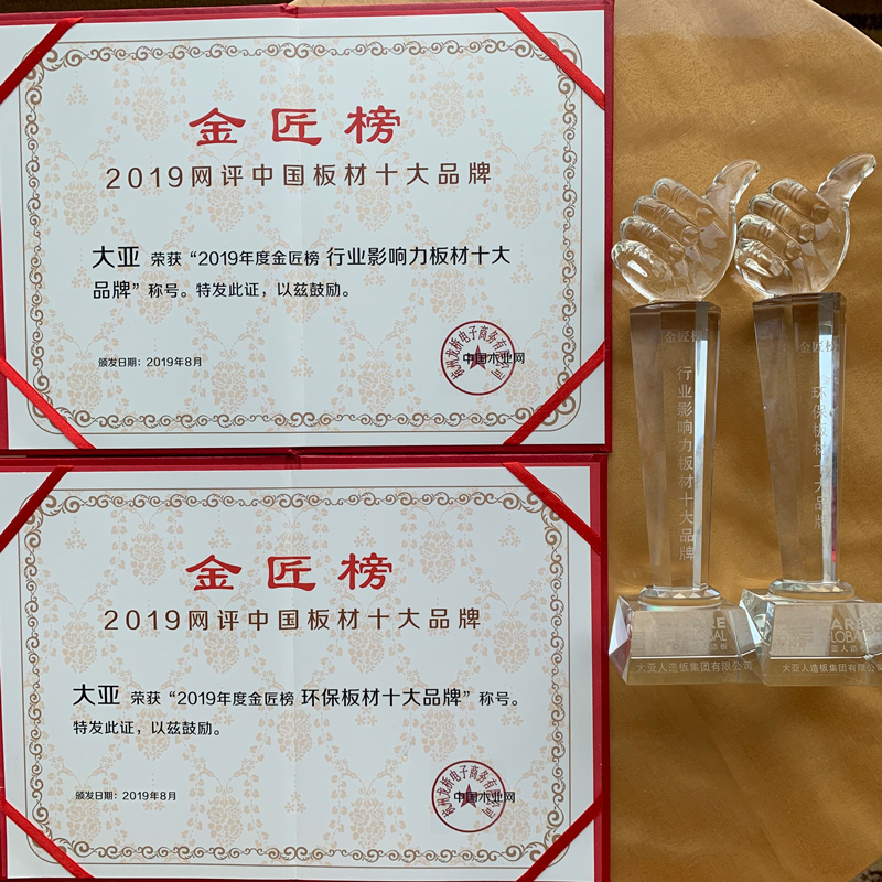 在9月2日晚舉行的中國木業網2019中國板材“金匠榜”網絡評選活動頒獎典禮上,大亞人造板又榮獲“行業影響力板材十大品牌”及“環保板材十大品牌”兩項殊榮,這是對大亞人造板的行業影響力和堅持綠色環保理念的肯定。